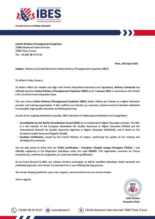 To better reflect our mission and align with French educational standards and regulations, Brittany Université has officially become Institut Brittany d’Enseignement Supérieur (IBES) as of 1 January 2024, in accordance with Article L731-14 of the French Education Code. The new name, Institut Brittany d’Enseignement Supérieur (IBES), better reflects our mission as a higher education provider and training organisation. It also reaffirms our identity as a dynamic, student-centred institution dedicated to accessible, high-quality education and lifelong learning. As part of our ongoing dedication to quality, IBES maintains the following accreditations and recognitions: Accreditation by the British Accreditation Council (BAC) as an Independent Higher Education provider. The BAC is a full member of the European Association for Quality Assurance in Higher Education (ENQA) and the International Network for Quality Assurance Agencies in Higher Education (INQAAHE), and is listed on the European Quality Assurance Register (EQAR).